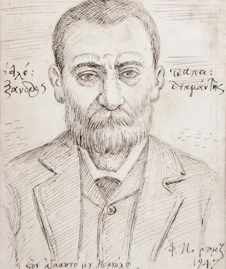 - Φώτης Κόντογλου (1895-1965), «Αλέξανδρος Παπαδιαμάντης», 1947. Μελάνι σε χαρτί, 18,8 × 14 εκ. Ιδιωτική συλλογή